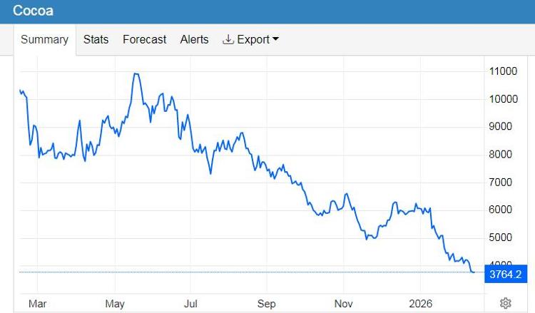 周三,国际可可期货价格跌破 3,800 美元,为 2023 年 10 月以来的最低水平,因市场寻求平衡全球需求疲软和供应增加。自今年年初以来,这种重要热带经济作物的价格已下跌近 40%,成为表现最差的商品。值得一提的是,可可刚刚在2025年录得有记录以来最大年度跌幅,下跌48.1%。与2024年5月创下的历史新高相比,下降幅度达到70%。供需失衡是造成当前可可价格暴跌的主要因素。需求方面,去年第四季度欧洲可可研磨量为304,470吨,同比减少8.3%,连续第六个季度下降,明显逊于市场预测的2.9%下降。欧洲市场占全球可可消费量的很大一部分,贸易商目前正在等待北美的数据和亚洲。亿滋、好时和卡夫亨氏等主要制造商将可可成本视为影响利润的主要变量。亿滋国际称2025年是“可可成本通胀创纪录的一年”,因为可可成本使净利润同比减少约47%。好时公司表示,由于可可成本吞噬了价格上涨带来的所有收益,其全年净利润暴跌 60.3%,卡夫亨氏的营业利润率从 32.5% 下降至 14.4%。供给方面,气候因素提高了生产预期。西非主产区(特别是科特迪瓦和甘托)土壤湿度充足。预计更多的降雨将促进动物生长并促进优质可可豆的生产,从而导致这个收获季节的二月和三月产量更高。由于购买意愿缓慢,主要可可生产国的库存正在增加。截至2月8日,自年初以来到达科特迪瓦港口的可可数量最新数据显示,去年10月1日当季产量达到12.63亿吨,同比增长4.5%。与此同时,加纳可可委员会(COCOBOD)透露,国际市场上的买家越来越多地放弃从加纳购买可可,因为可可的价格高于其他生产国。目前约有 50,000 吨未售出的可可滞留在加纳港口。产品研究机 一月底,秋季关石的涨价正在伤害工人。恶劣的储存条件正在影响可可豆的质量,一些农民因担心收不到钱而不愿收获成熟的可可豆。为了缓解专业人士的压力,科特迪瓦于1月29日正式启动一项战略行动,回购自2025年11月以来滞留在该国仓库和港口的数千吨未售出的可可。加纳本周召开紧急会议,决定采取行动回购可可。加快向农民支付可可豆费用,并增加可可豆的国内加工。加纳可可委员会正在探索新的融资模式,旨在减少对原可可豆出口的依赖,促进当地可可加工并提高该行业和农民收入的可持续性。目标是使加纳成为区域可可加工和巧克力制造中心。 (中国经济新闻)
